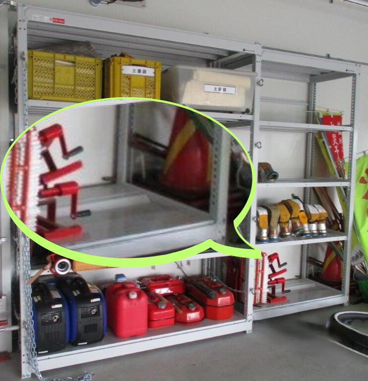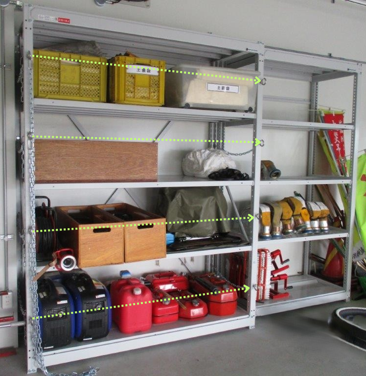 安全性と機能性を両立した「チェーン付き中量ラック」と「ホース収納棚」は、緊急時でも素早く器具を取り出せる設計。