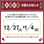 2025年12月24日 / 最終更新日時 : 2025年12月24日 k-filing お知らせ 年末年始休業のお知らせ 平素は格別のお引き立てを賜り、厚くお礼申し上げます。弊社では誠に勝手ながら、下記日程を年末年始休業とさせていただきます。 ■年末年始休業期間 2025年12月27日(土)~2026年1月5日(日) 休業中にいただいたお問 […]